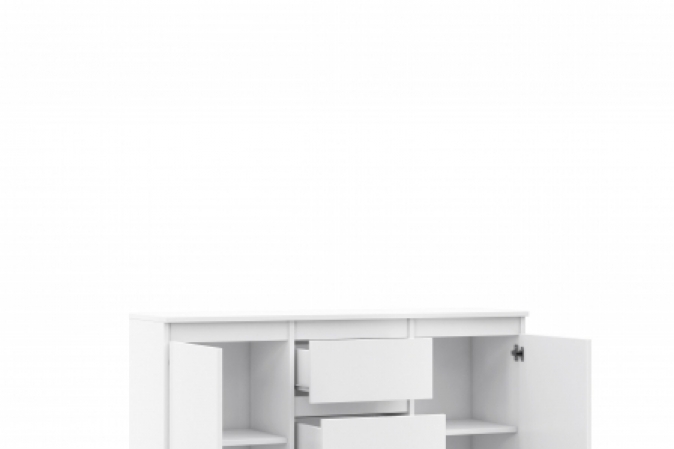 ✅ Tył komody wykonany z płyty HDF w kolorze białym.